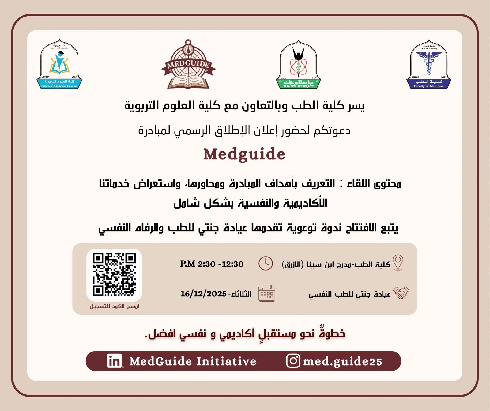 17 كانون1/ديسمبر 2025 الإطلاق الرسمي لمبادرة MedGuide Official Launch of the MedGuide Initiative 17 كانون1/ديسمبر 2025 المقال التالي: محاضرة للتعريف بامتحان الجودة التالي Share غرِّد Share share with Whatsapp